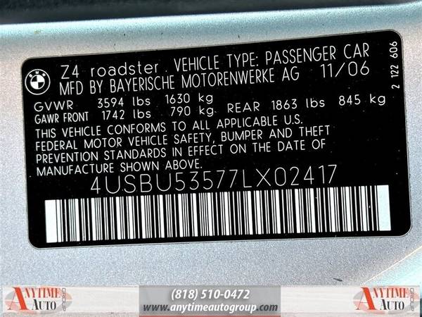 Get ready to experience the thrill of the open road in this stunning 2007 BMW Z4 3.0si! Powered by a robust 3.0L I6 engine delivering 255hp and 220ft. lbs. of torque, this roadster is sure to provide an exhilarating driving experience.