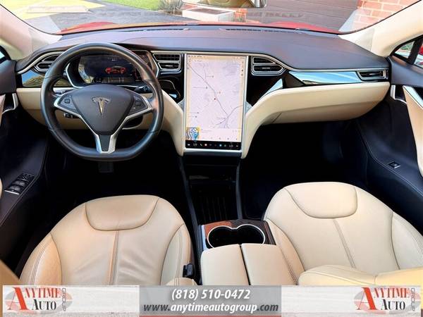 The exterior of this Model S showcases a striking Red Multi-Coat finish, which not only enhances its visual appeal but also reflects Tesla's commitment to quality and style. The sleek lines and aerodynamic design contribute to its modern aesthetic, making it a standout on the road.