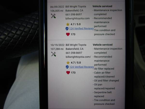 On 1/2/23 at 108,180 miles at Bill Wright Toyota, Bakersfield, CA: Vehicle serviced, Brake fluid flushed/changed, Engine oil/fluid leak checked, Power steering fluid flushed/changed, Tire condition and pressure checked.