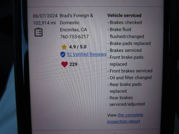On 6/7/24 at 102,914 miles at Brad's Foreign & Domestic, Encinitas, CA: Vehicle serviced, Brakes checked, Brake fluid flushed/changed, Brake pads replaced, Brakes serviced, Front brake pads replaced, Front brakes serviced, Oil and filter changed, Rear brake pads replaced, Rear brakes serviced/adjusted.