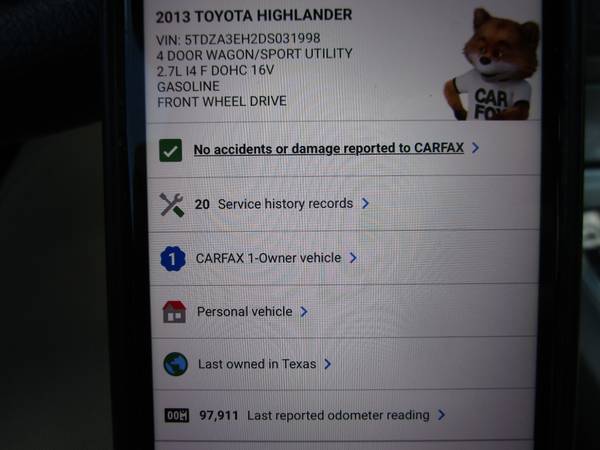 I am currently selling a nice 2013 Toyota Highlander 4-Door Sport Utility Vehicle, 2.7L Inline 4-Cylinder Engine, Front Wheel Drive, Automatic Transmission, with 99k original miles.