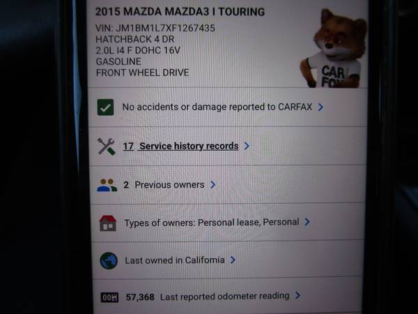 I am currently selling a nice 2015 Mazda 3i Touring 4-Door Hatchback, 2.0L Inline 4-Cylinder Engine, Front Wheel Drive, Automatic Transmission, with 58k original miles.