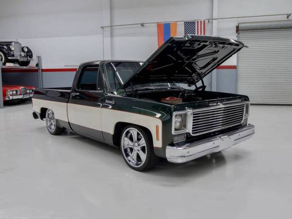 Finished in a striking Forest Green and Ivory two-tone, the truck’s clean bodylines are complemented by chrome bumpers, a tubular grille, and 20-inch Boss Motorsport wheels. The 350ci Chevrolet V8 is paired with a TH350 automatic transmission and enhanced by an Edelbrock Hi-Rise intake, 4-barrel carburetor, tubular headers, and dual exhaust for improved performance and sound.