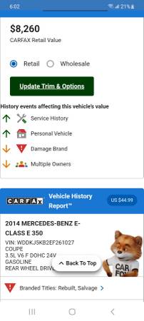 Rebuilt title as it had a small rear end accident ( see carfax report screenshot in photos) It was rebuilt professionally and price reflects this. Carfax report included and shows value at $8,200. It runs and drives great. Has 144k. Ice cold AC. Heated seats. Panoramic sunroof and much more. Serious buyers only call 818.855.729two