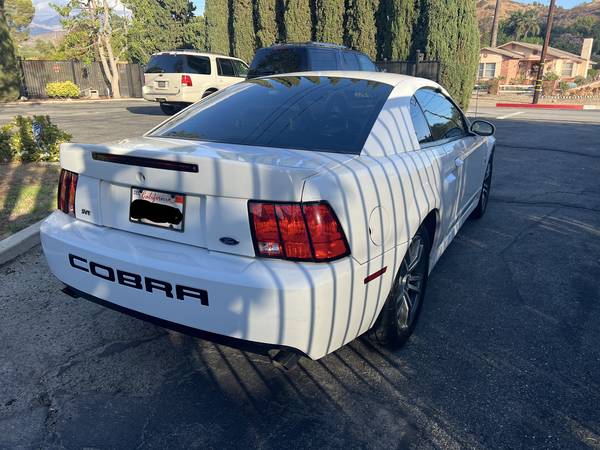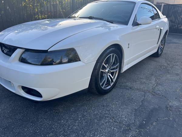 2003 Ford SVT Mustang Cobra, Supercharged 4.6L V8 with Intercooler -- 390 hp, 390 lb-ft torque, with T56 6 speed Tremec manual transmission. The original “17 tires/wheels come with the unit, however she’s wearing 2020 Mustang wheels with 275/40R/18 99W Firestone Indy 500 tires. This is a one owner garage queen California weekend car with 43,000 original miles. With new battery, brakes, hoses, filters, coolent, and fresh Mobile 1, she’s out of the tune up/Dyno shop, and ready for the road. You could jump in it and drive it to Florida tomorrow. Never been wrecked or repaired, she shows her 22 years like a solid 9.5. Price is pretty firm, no low ballers, I don’t need help selling it, and I’m not looking for any trades. Fred. eight one eight, 406, seven seven four five…….