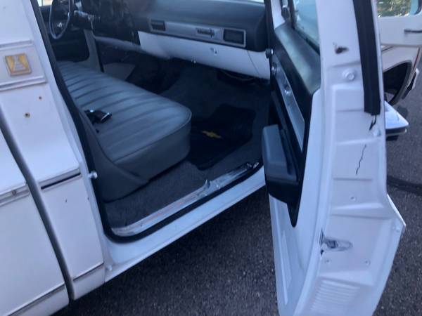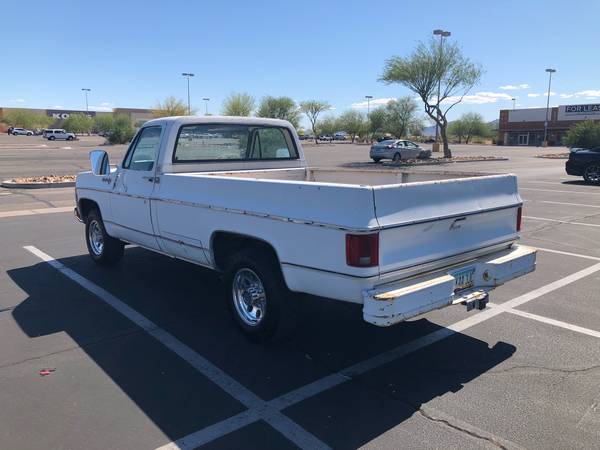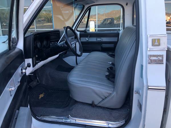 This vehicle features a 350 cubic inch motor and a 350 transmission. The truck is in good condition, with newer rims and tires, a new vintage air system, new headers and exhaust, a new intake, exhaust, carb, distributor, fuel pump, gas tank, steering box, plugs, and wires.