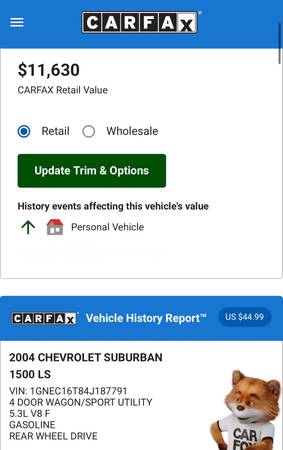 My name is Tony and I have my 2004 Chevrolet Suburban LS with 92k miles up for sale (VIN - 1GNEC16T84J187791). Let me know if you need and more photos or information. I really babied this car never had any issues, made sure it was maintained properly.