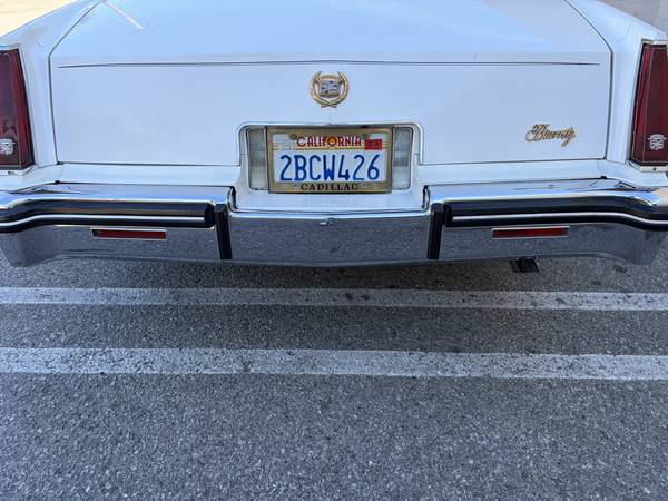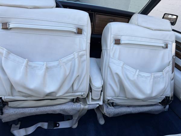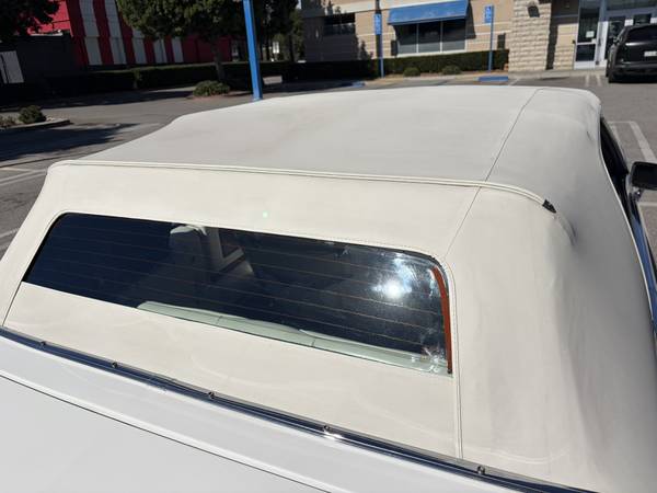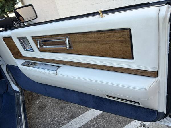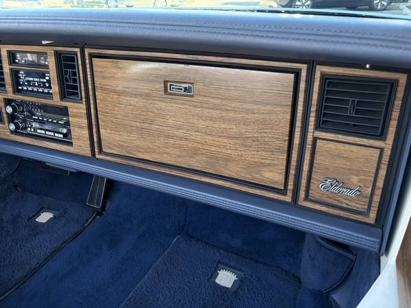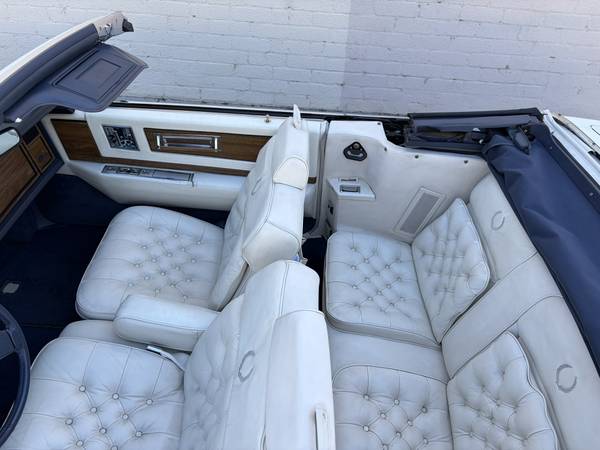 Rare 1984 white on white/blue Biarritz Eldorado convertible. CA car, no rust, body in great condition. Biarritz gold package with gold trim, emblems, keys, etc. Runs great, starts up every time, doesn't overheat (I put the radiator tabs in, if you know you know). Brand new convertible top. New Vogue tires. New brakes. New weatherstrips. New plugs and wires. All the gauges, switches, and lights work... even the little hood signals. And the hood emblem horn works too! Notice period correct license plates too... it's the little things. It could use new fillers up front... like any of these cars, they all need replacing.