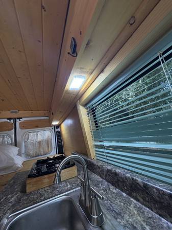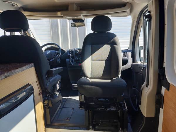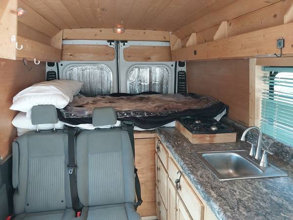 Van Life 2017 Ram ProMaster High Roof 136" wheel base. 84,050 miles. Ready to drive to your next destination! Just ask and I can send link to More pics. Nearly new BF Goodrich K02 tires. Full camper build with Rock wool insulated walls and ceiling, Mylar insulated panels cut outs for all windows. Dometic 3 way fridge (currently set up on propane), Wedgewood 2 burner propane stove, sink with electric pump and 5 gallon water tank, Renogy 100ah lithium battery, DC to dc charger, LED lights, USB charger, van tech roof rack, Mr Buddy propane heater, 2 x 5 gallon propane tanks, New full size memory foam mattress and new bedding. Has 2 removable rear seats with seat belts. Front passenger seat swivels 360 degrees. All new plumbing and electrical for the camper build. Lots of storage, room to grow and improve. Older build. Includes tire chains. Located in Van Nuys CA