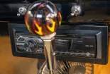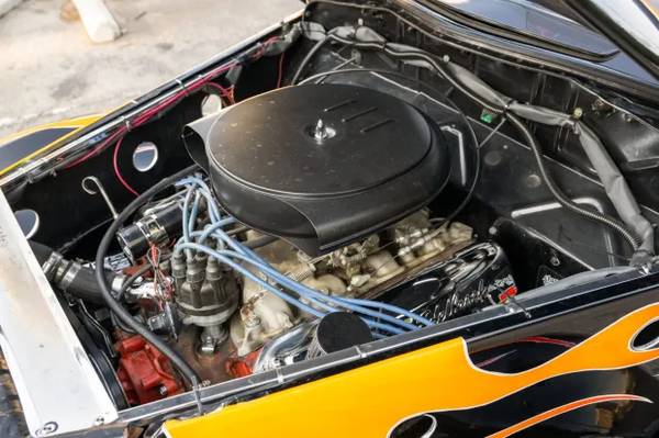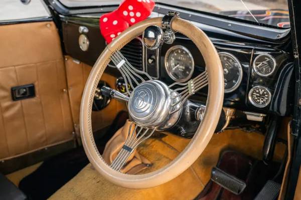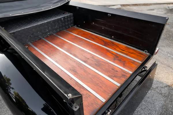The replacement steel pickup bed was refinished with stained wood slats and metal runners and is covered by a snap-on tonneau. A checker-plate fuel tank is mounted behind the bulkhead.Red-painted 15″ steel wheels wear chrome hubcaps and are mounted with BF Goodrich Silver town Radial wide-whitewall tires. A matching spare is fitted beneath the pickup bed. The truck rides on a modified suspension, and the seller notes a power-assisted front disc and rear drum brake system were fitted during the build.The banjo-style steering wheel features a V8 horn button and a spinner knob. Smiths instrumentation includes a 180-mph speedometer, a tachometer, and readouts for fuel level, oil pressure, and coolant temperature. The odometer shows 9k miles. This was a show truck has been driven very little.The 351 ci Cleveland V8 was installed under prior ownership, and it breathes through an Edelbrock carburetor and a Batwing-style air cleaner assembly.Power is sent to the rear wheels through a three-speed automatic transmission.