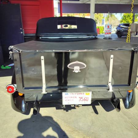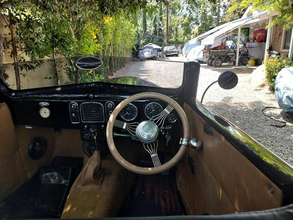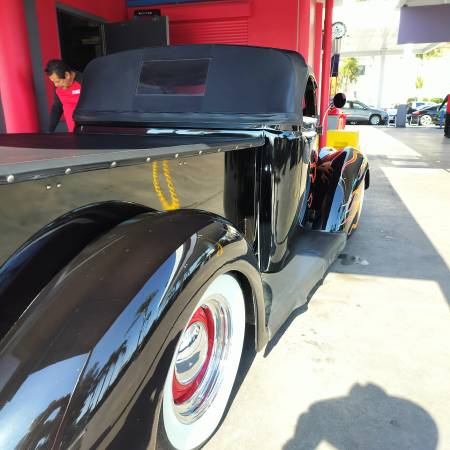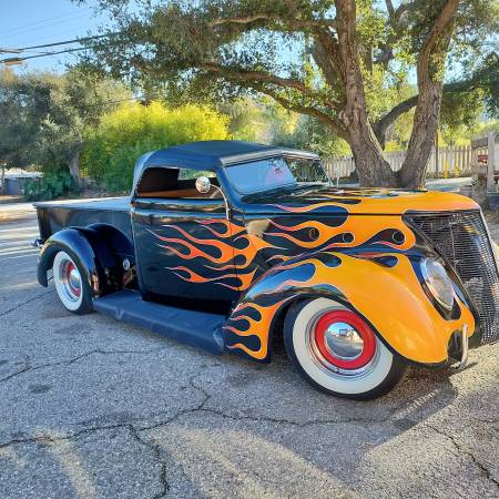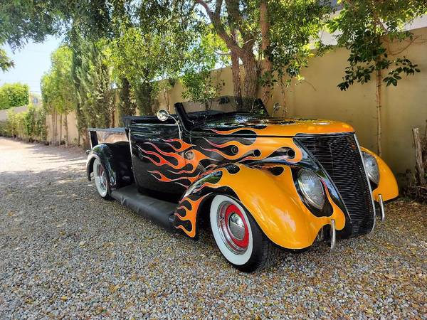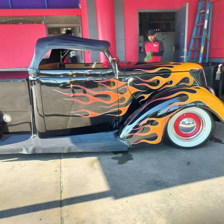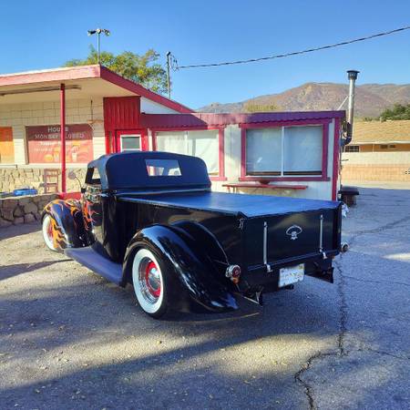 This Ford pickup street rod was modified under prior ownership. It's Australian. They replaced the cab roof with a black soft top, installing a replacement steel pickup bed and fiberglass fenders, and repainting the exterior in black with flames on the front of the vehicle. The vehicle is registered as a 1937. The 351 cubic inch Cleveland V8 is equipped with an Edelbrock intake and carburetor, and power is routed through a three-speed automatic transmission. Australian right-hand-drive cab features a banjo-style steering wheel, a Pioneer stereo, Smiths instrumentation, and fixed-back metal seats with bottom cushions. The truck rides on a modified suspension and red steel wheels with wide-whitewall tires, and additional equipment includes front disc brakes, a refinished pickup bed, dual horns, and fishtail exhaust finishers. Acquired by the seller in 2022, this custom Ford pickup roadster is now offered with a clean California title in the seller’s name.