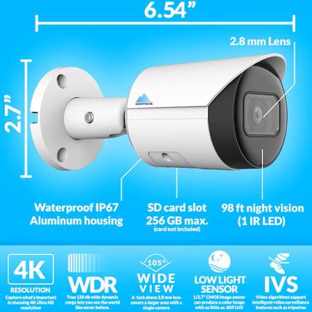 I have for sale 4K bullet type 16 pieces Montavue security cameras each comes with 100' cable model MTB8105-C. For more info on the cameras google the model number or check out Montavue web site. Cameras are brand new, I'm selling all 16 at once and not individually. I also have a 16 cameras compatible DVR, but it is password locked and I'm not sure how to unlock it. I'm including it for free with the purchase of the cameras. $300 cash and pick up only no exceptions. I will not communicate by e-mail for more info call or text threetothre/595/eightsevnonefive