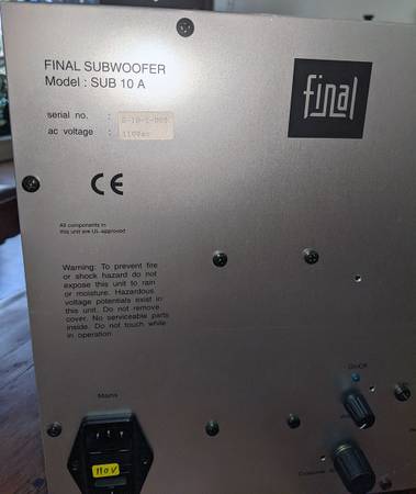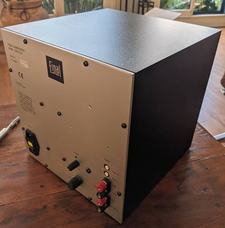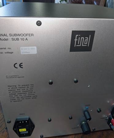 Offered for sale: Vintage Final Audio Hi-End Dual Speaker Subwoofer Model Sub 10 A. Very rare design. I had a very hard time finding out what this is, what are the specs, so I contacted the company and got a response: it was introduced 34 years ago, and somehow it is brand new in the box, definitely never used. Provides 200 watts power, frequency range is from 30 to 200 HZ, Class AB and it was specially designed for Electrostatic Speakers. Feel free to contact with any questions you may have and if interested call show contact info