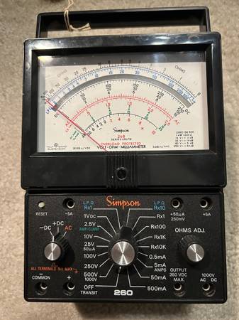Selling my Simpson Multimeter/VOM. I've used it a few times, never left my house. It is in new condition. Completely functional, includes probes, alligator clips, Batteries, Manual, and original shipping container. Never dropped or overloaded. No scratches, dents, or damage of any kind.