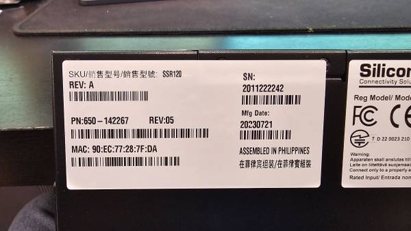 Model: SSR120 Revision: A PN: 142267 Box Contents: - Router - Power Adapter - Power Cord - Ethernet cable with serial connector