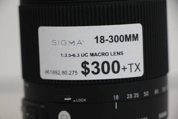 We are selling our Sigma 18-300MM 1:3.5-6.3 DC Macro Lens. Please call or text with questions . Please reference Stock # 61892 when you call. ppc