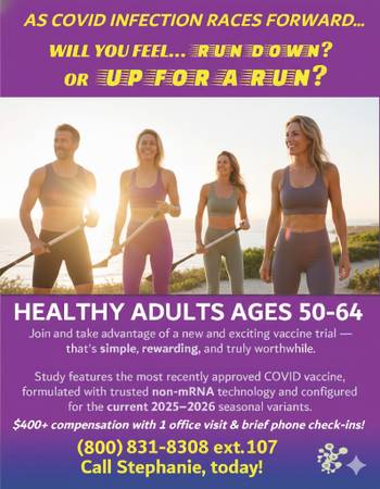 New Healthy-Volunteer study for Adults ages 50 - 64. This research study is being conducted to see if the study vaccine (NVX-CoV2705) prevents COVID-19 and to provide additional information on the safety of the study vaccine in adults 50 to 64 years old who do not have an underlying condition that puts them at high risk for severe outcomes from COVID-19.