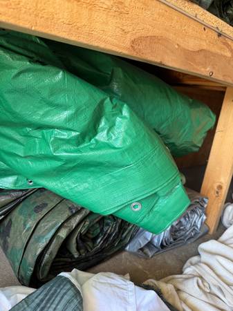 Lot Of 20 Tarps - XXL TARP - *Read Description First - there’s around 20 tarps here of various sizes - sizes listed below. They were used over the course of two weeks almost entirely inside of building where there was a small rain leak in the roof. Tarps are clean with practically no use - Only two of the tarps were used on the outside the building for that course of two weeks and those are the largest tarps. All the tarps are in like new condition selling for 50% of purchase price