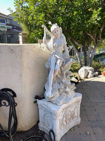 Bring a touch of classic charm to your garden or patio with this beautifully sculpted outdoor statue. Featuring a graceful woman playing a harp, this piece doubles as a gentle waterfall fountain. Integrated lighting adds a warm, enchanting glow in the evening, making it a perfect focal point for any outdoor space. It's an ideal decorative element that combines art, water, and light all in one. Includes base