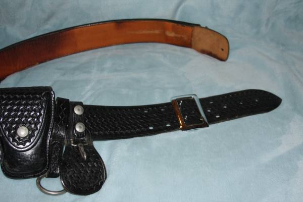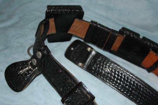 Belt includes handcuff case (stamped in the back w/ a star & TEX, then maybe the name of a city?), twin loader pouch (stamped in the back w/ F.M.PITT Co. San Gabriel Calif.) and lots more for your belt!
