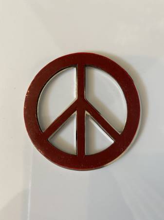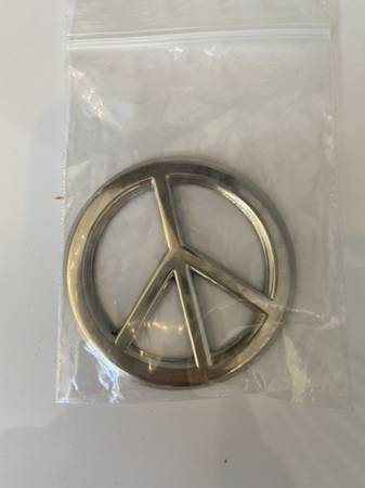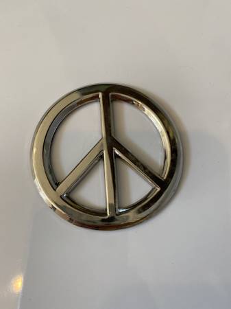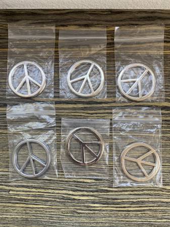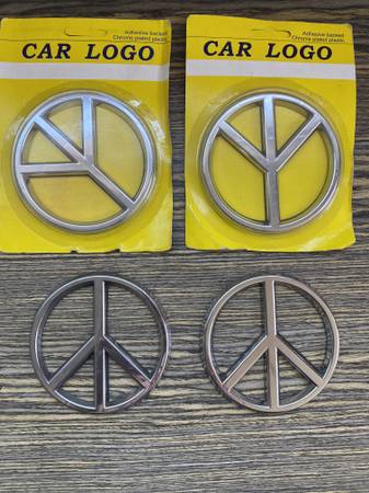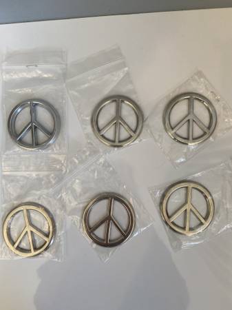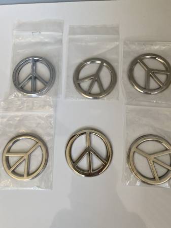 4 - Peace Sign Logos Lightweight Chrome Plated Plastic Adhesive backing $8.00 each $20 for 4 (one is missing backing) Great for Music Cases and decoration