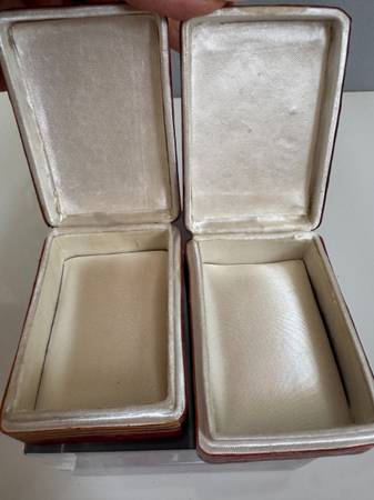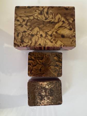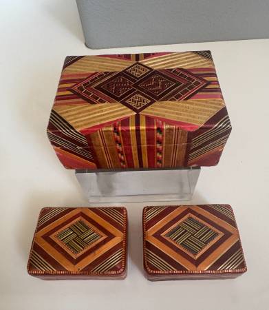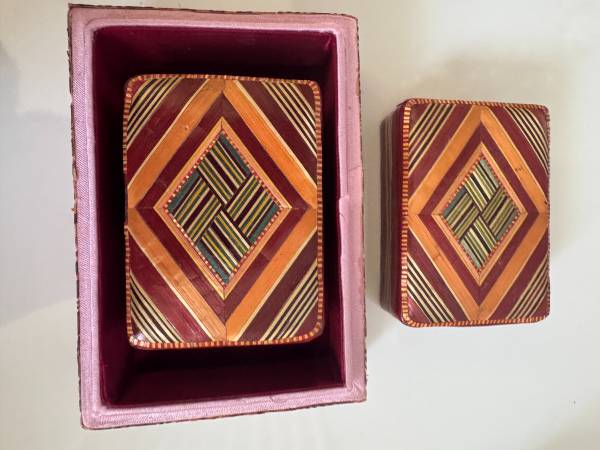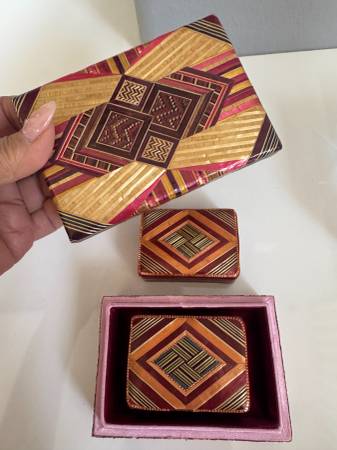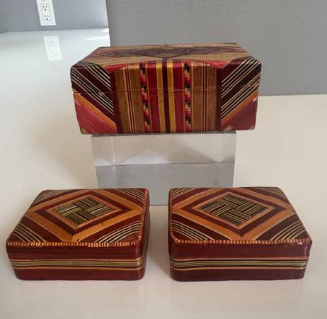 3 trinket boxes - they look hand made with some sort of palm that is perfectly lined up and a silky lining.