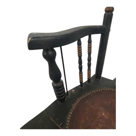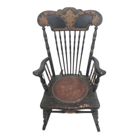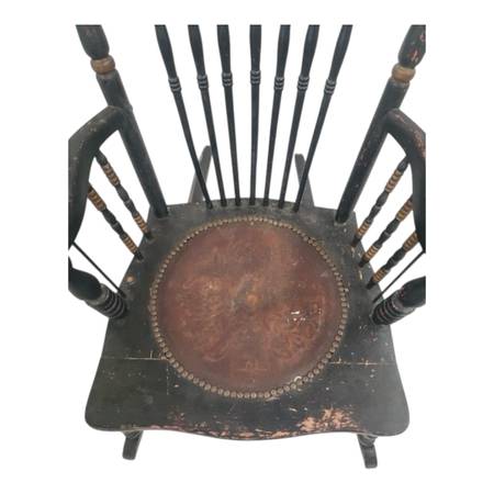 Antique wooden nursery rocking chair with a leather seat, perfect for display or light use. This vintage piece features turned spindle arms, decorative carved crest, and original patina. Measures...