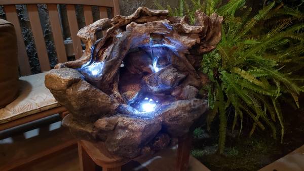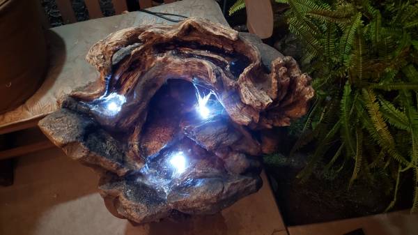 Waterfall fountain for indoor or outdoor use. Made of resin and has a recirculating pump and LED lighting. Works perfect and is very soothing to watch and listen to. See pictures for reference. I also have a MP4 video of the fountain operating at night time that I can send you if you would like to see it operating. If you are reading this posting it’s still for sale, so do not ask if it is still available. I will delete this posting when the item is sold. Call 8 one 8 - three 6 eight 8 six 0 seven (this is a landline number so it does not receive texts) or email back with your phone number and posting subject if you're interested and I will get back to you. No scammers need not to reply back. Thank you.