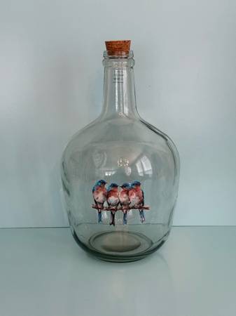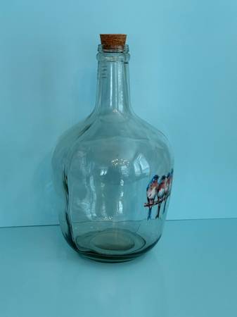 12”H L Green Glass Jug with Birds and Stop Cork New Condition So Adorable! 12” H 6.5” W