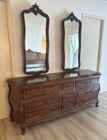 California King headboard; 2 bedside tables; 2 lamps; dresser measures 78" long, 32 1/2" high, and 21" deep and 2 mirrors 48 1/2" high, 20 1/2" wide.