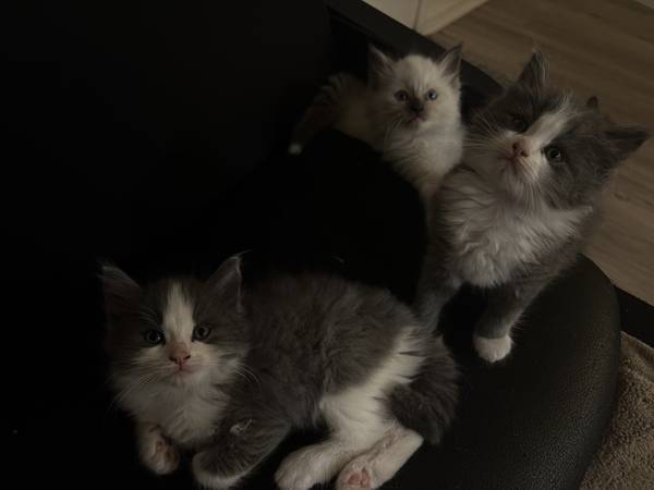 My Fiancé and I are re homing ( 2 ) 12 week old Male Mitted Rag doll kittens! They’ve all been de-wormed, litter trained, and are super vocal, cuddly, and love being held. They’ve grown up around people and get lots of attention every day, so they’re really social and affectionate.