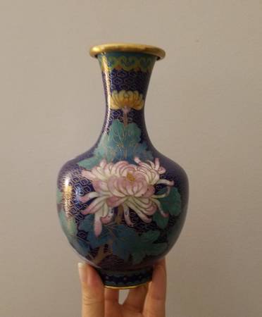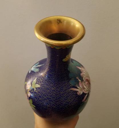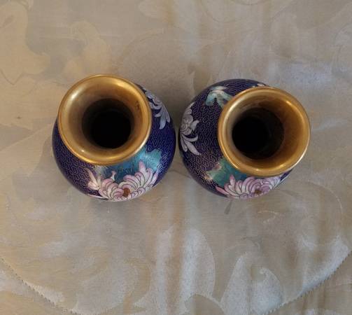 Vintage set of blue cloisonné vases with gold trim