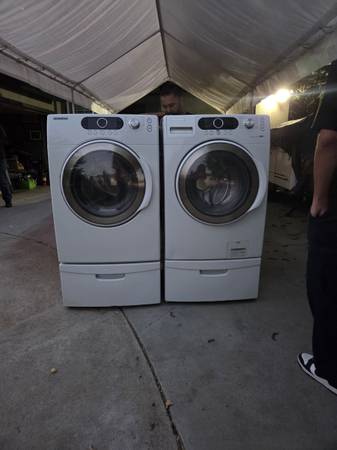 Samsung VRT Washer and gas dryer set with pedestal drawers 3.9cu .Working condition, we just got a bigger set of SAMSUNG. They make good washer and dryers if you know how to maintain them as we tried to. The washer comes with hoses not the dryer. Text show contact info