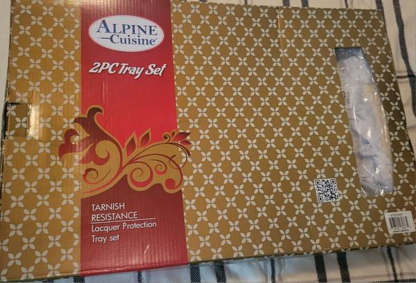 Brand new in the original box 2PC Serving Tray Set. Measurements: Large Tray 17.32" x 12.52" x 1.06" Small Tray 14.17" x 10.24" x 0.98" Made in China Metal, Gold color Hand wash only