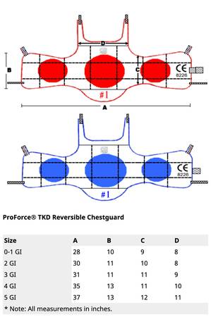 This reversible t ae kwon do style chest protector features a shock absorbent rubber body that has been covered in soft vinyl for added durability. Features red circle point scoring zones on one side and blue on the other. Long, elastic shoulder straps cross in the back and tie through the side loops while hook and loop fasteners help to ensure a snug fit. Sizing for the Pro Force Gladiator TKD Reversible Chest Guard is based on your uniform size, so check your uniform size carefully.