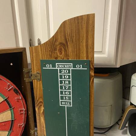 Includes: The set includes a dartboard and a matching oak cabinet, a complete and functional dart game setup.