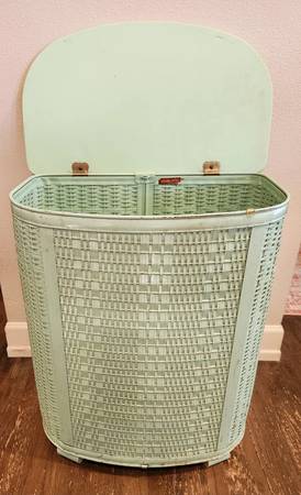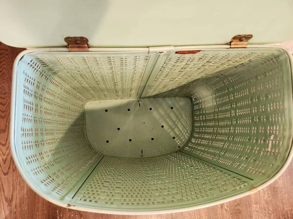 This vintage wicker clothes hamper from the 1950's is in near mint condition! There are no scratches and virtually no paint loss. It is free of dents; the hinges work well and the lid closes as it should. It is very solid and stable.