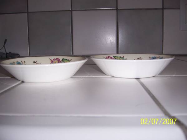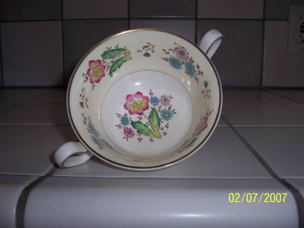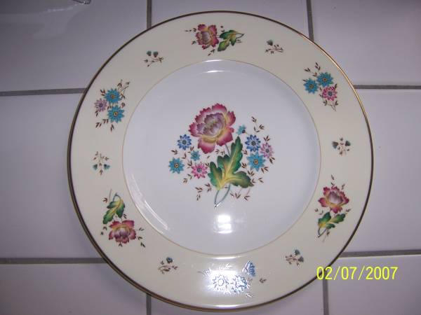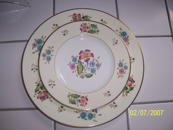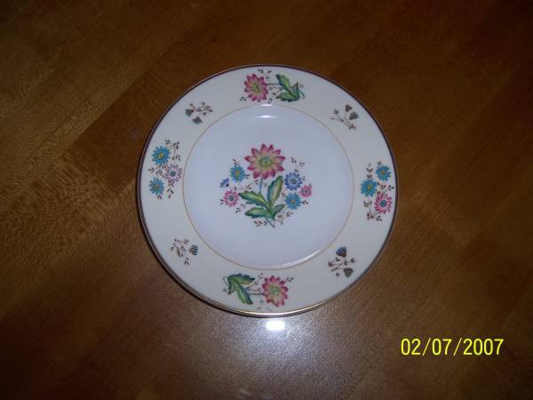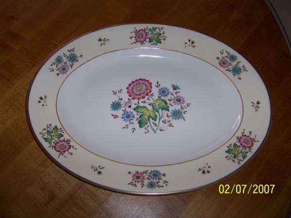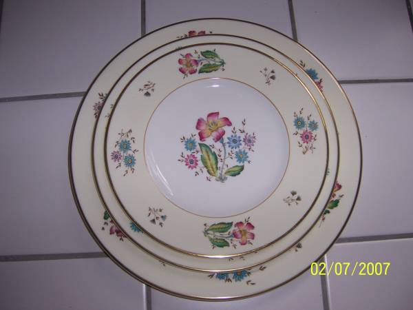 Vintage Wedgwood bone china service in Harewood pattern. Ivory rim with gold edge line. Purchased new in 1945. China is in excellent, if not mint, condition. 110 pieces total. Service for 12 includes dinner plates, salad plates, luncheon plates, bread and butter plates, teacups and saucers, dessert bowls, double handle soup bowls, 11" oval platter, 13" oval platter and 15" oval platter. $300. Reasonable offers will be considered.