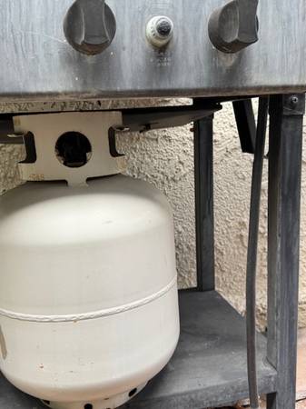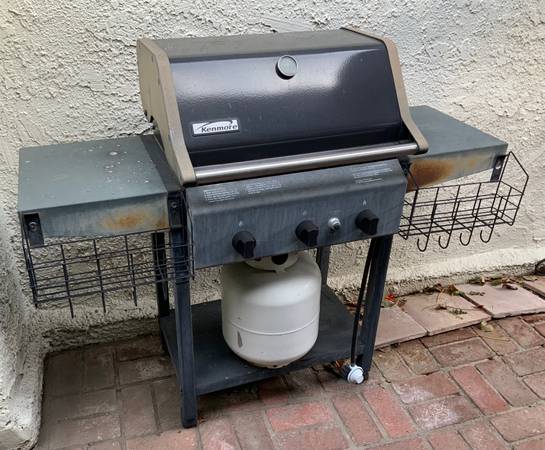 "Oldie but goodie" used gas barbeque grill with side shelves and propane tank. Built to last forever. It measures 52" wide with removeable side shelves and 25" without them if you were short on space. It is 21" deep x 44" high. It could use a little BBQ black Rustoleum spray paint on the rusted areas if you are handy.