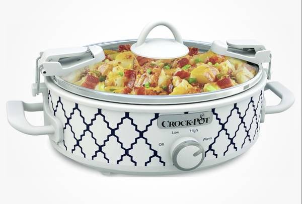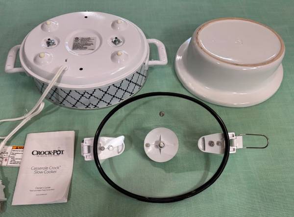 This is considered a “cook and carry” style oval crockpot with a nice patterned design. It has a locking lid so it won’t spill if you are transporting food in it. You can even take out the nice white porcelain dish & serve directly from it. It should go with any decor! I purchased this new because it was so attractive & then ended up never using it. Now we are downsizing and getting ready to move. Please feel free to ask any questions. You can come over to our open garage and take a look.