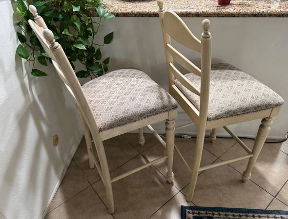 Two tall wooden chairs with patterned cushions. The wood is a neutral beige with an antique or distressed look. The seat is 30” tall and 20”wide. The entire height is 46”. The seats appear to be easy to recover and the wood could be repainted if you desired a custom look. Very sturdy and strong.