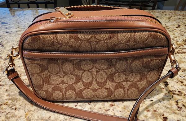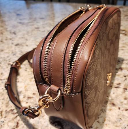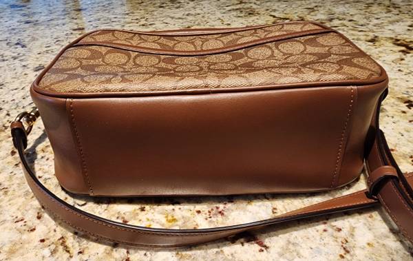 Original price $350 new, never used. 9.5 inches long 6.5 inches high 3 inches wide Gold hardware 2 zippers Adjustable strap
