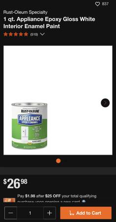 1 qt. Appliance Epoxy Gloss White Enamel Paint. New, sealed. Only $20. Amazon price is $30 after tax. 2 available. Great for painting appliances, kitchen sink, bathroom sink, etc.