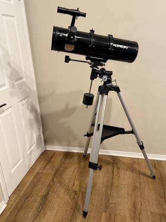 Sturdy EQ-2 equatorial telescope mount and adjustable tripod allows manual slow-motion tracking of celestial objects as they appear to migrate across the night sky.