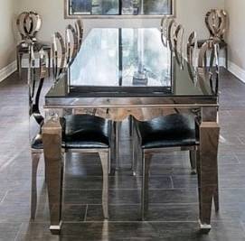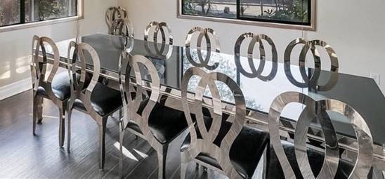 Gorgeous 9 foot,12 chair black tempered glass dining table with gold accents. Wonderful for entertaining over the holidays!