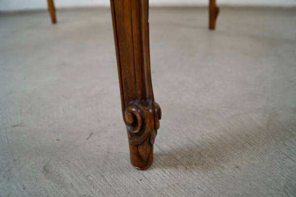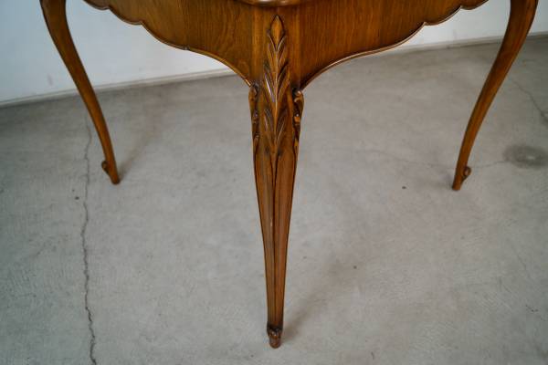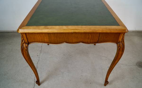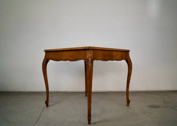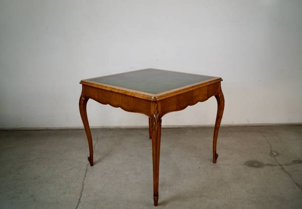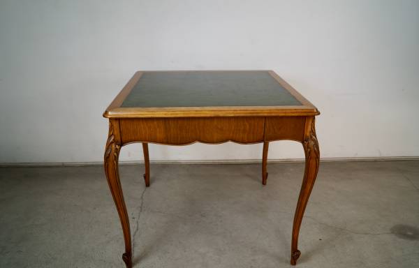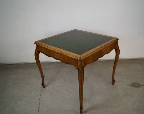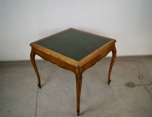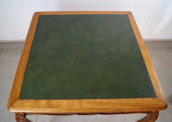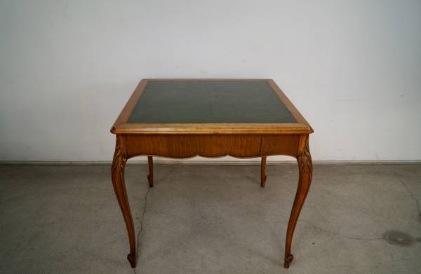 Antique poker table for sale. From the 1930's, and in excellent original condition. It has a French Louis XV style and aesthetic, and is well made. It has wonderful wood carvings on the cabriole legs, and has a single drawer on each side for poker chips and poker cards. The drawers are dovetailed on both ends. It has a leather inlaid top that is a dark forest green. It's a beautiful table, and a great size for a game table or dining table. It's made of mahogany in a walnut top, and contrasts nicely with the green leather. It's a great piece to decorate any space or for a breakfast table. The measurements are 33" wide x 33" wide x 29 1/2" tall.