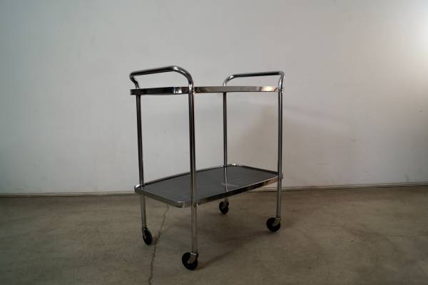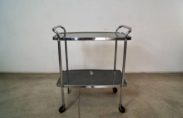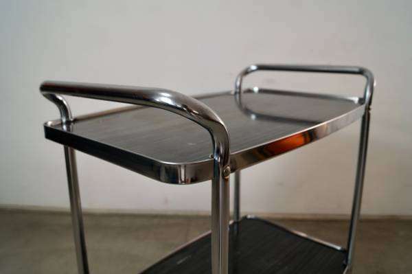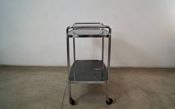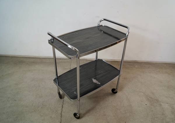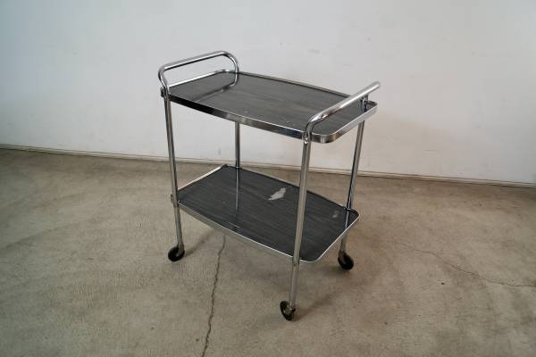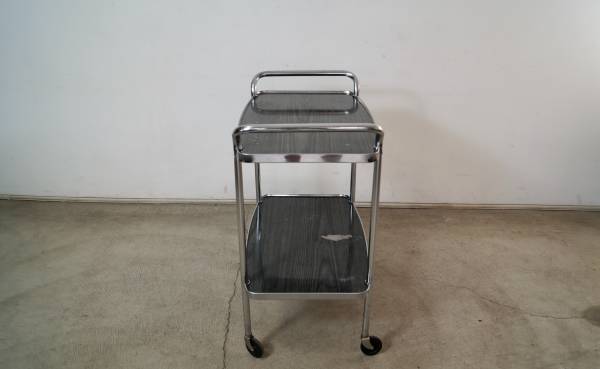 Vintage 1950's Midcentury Modern bar cart for sale. Can also be used as a media record player stand. It's really well built, and has a cool vintage design. It's made of chrome and has metal shelves in a gray faux wood grain finish. The chrome is in excellent condition. The metal shelves show some vintage wear as shown. It has nice tall casters that glide smoothly. The measurements are 32 3/4" tall x 27" wide x 17" deep.