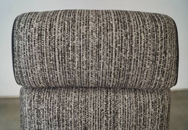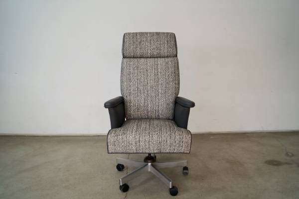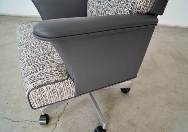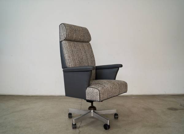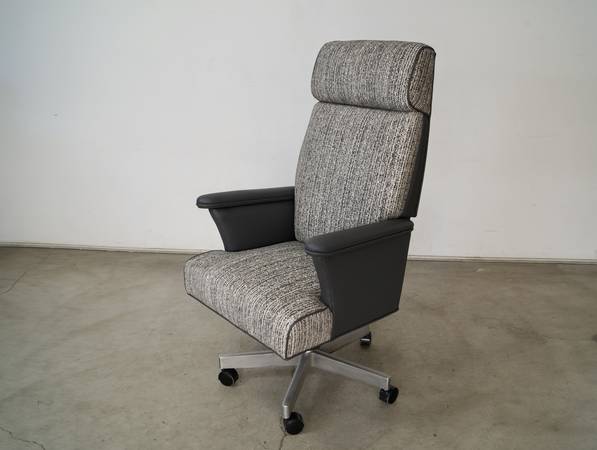 Vintage original Midcentury Modern office desk chair for sale. In the manner of Monteverdi Young designs. This chair has been professionally reupholstered, and is ready to be enjoyed again. We selected a very high-end designer textured tweed in white and variations of gray. It has incredible texture, and is beautifully woven. For the exterior of the chair and piping we chose a gray vinyl that contrasts beautifully with the tweed. It came out divine. It has an aluminum base with the original black casters. The height is adjustable, and it also reclines. The seat has springs. This chair is extremely comfortable, and very well made. The design of the arms give it an atomic aesthetic. It's a great executive chair. The measurements are 26 1/2" wide x 30" deep. The seat height goes from 18-21." Total height goes from 47-50."