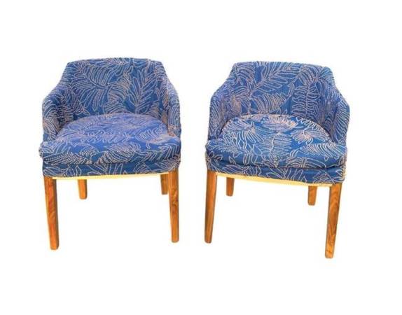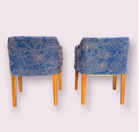 Set of 2 vintage twin Midcentury modern chic style low profile handsome accent corner chairs / desk chairs / kitchen dining chairs accent matching twin chairs. Slipcovered in Justina Blakeney's high quality Jungalow fabric for easy on and off washing. Fabric is navy blue with intricate yellow stitching in bold leaf pattern. Gently used. Or could have seat coverings made in any fabric of your choosing to change it up. Perfect for office seating or desk chair or accent dining chairs or breakfast nook chairs.
