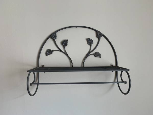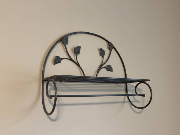 Wall-mounted metal shelf with a built-in towel bar. Features a decorative leaf and vine motif with a matte black finish. Slatted shelf suitable for lightweight storage or display. Integrated towel bar below is ideal for bathroom or kitchen use. Mounting holes on back.